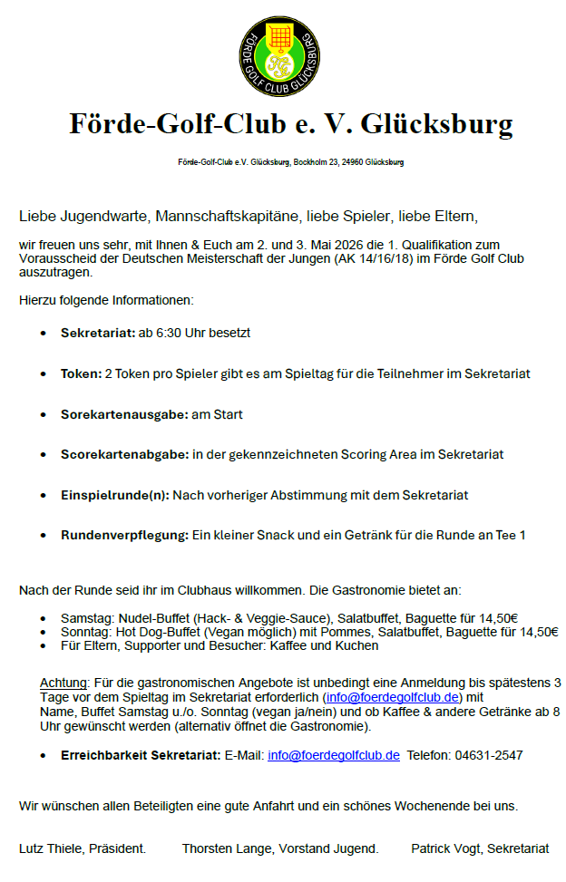 Info Schreiben des Förde GC Glücksburg an die Spieler: