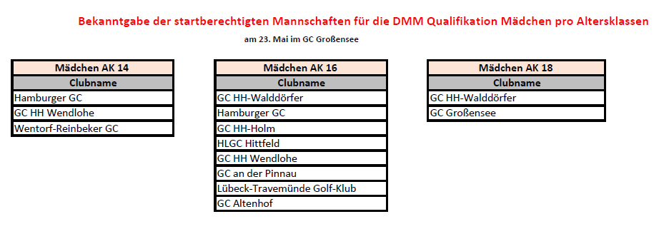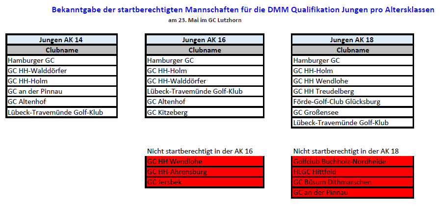 Am 8. Juni im Lübeck-Travemünder GK qualifizierten sich in der AK 18 der Jungen die Mannschaften des GC am Sachsenwald und GC Buchholz-Nordheide für die DMM AK 18 der Jungen. In der AK 16 der Jungen qualifizierten sich der Hamburger GC und der GC HH-Ahrensburg und in der AK 14 der Hamburger GC und der GC HH Hittfeld - Herzlichen Glückwunsch und viel Erfolg bei der Deutschen Mannschaftsmeisterschaft AK 14, 16, 18 der Jungen.