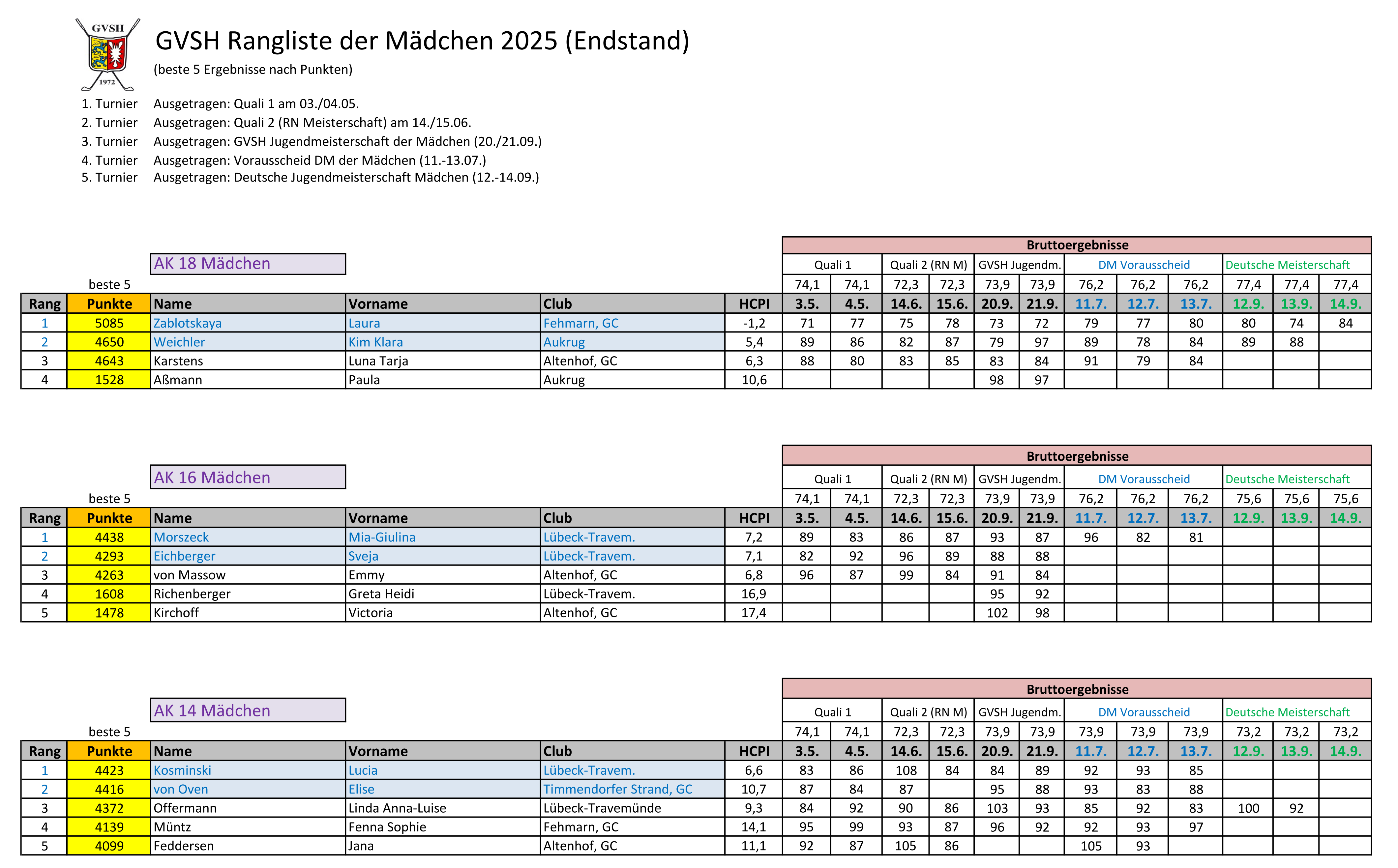 Für die GVSH Jugendrangliste werden die besten 5 von maximal 12 Runden gewertet - siehe Ranglistenwertung 2024. Die Plätze 1 und 2 erhalten 2025 die GVSH Blue Card (sofern Heimatclub GVSH) - siehe Ranglistenwertung.