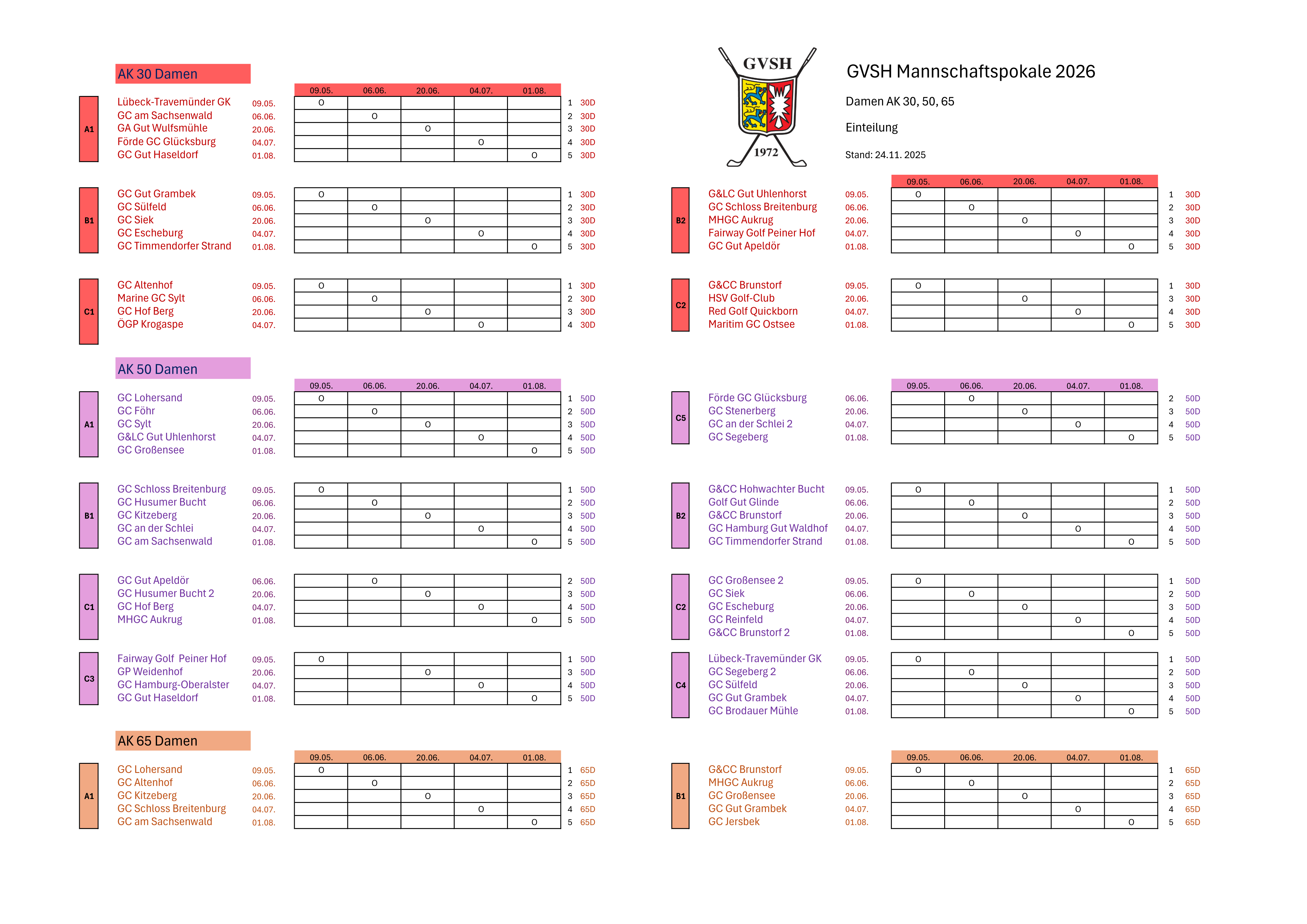 Die Einteilung 2022 für den GVSH Mannschaftspokal AK 30 der Damen liegt vor.
