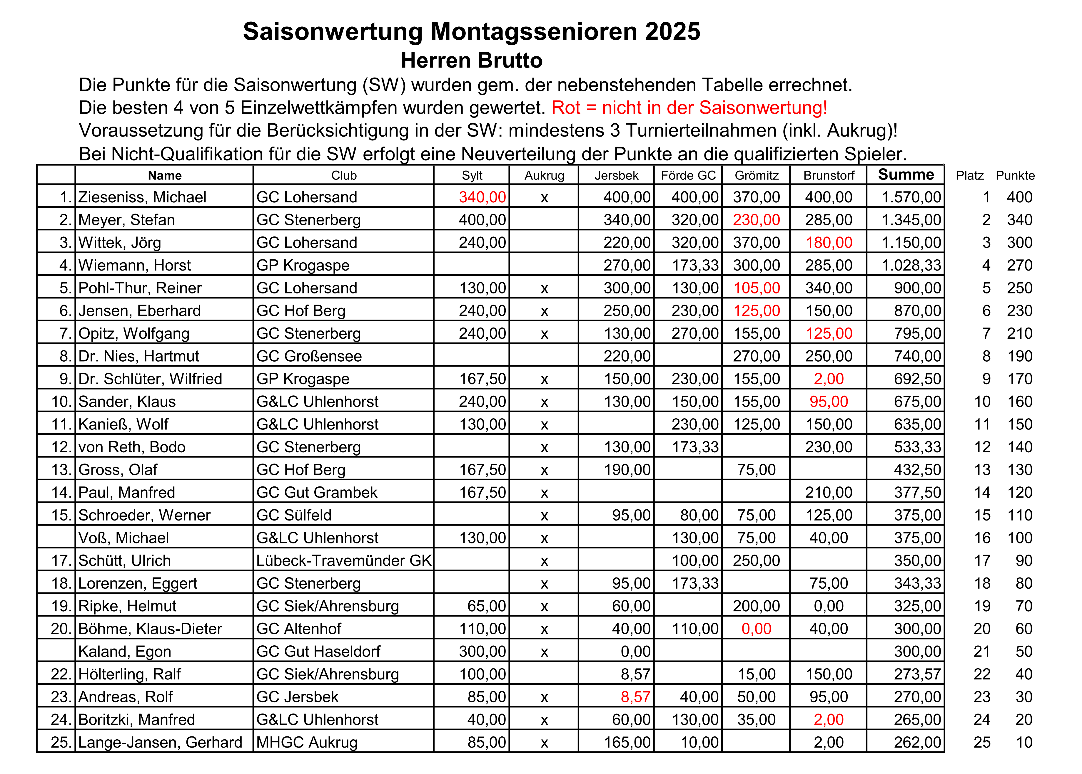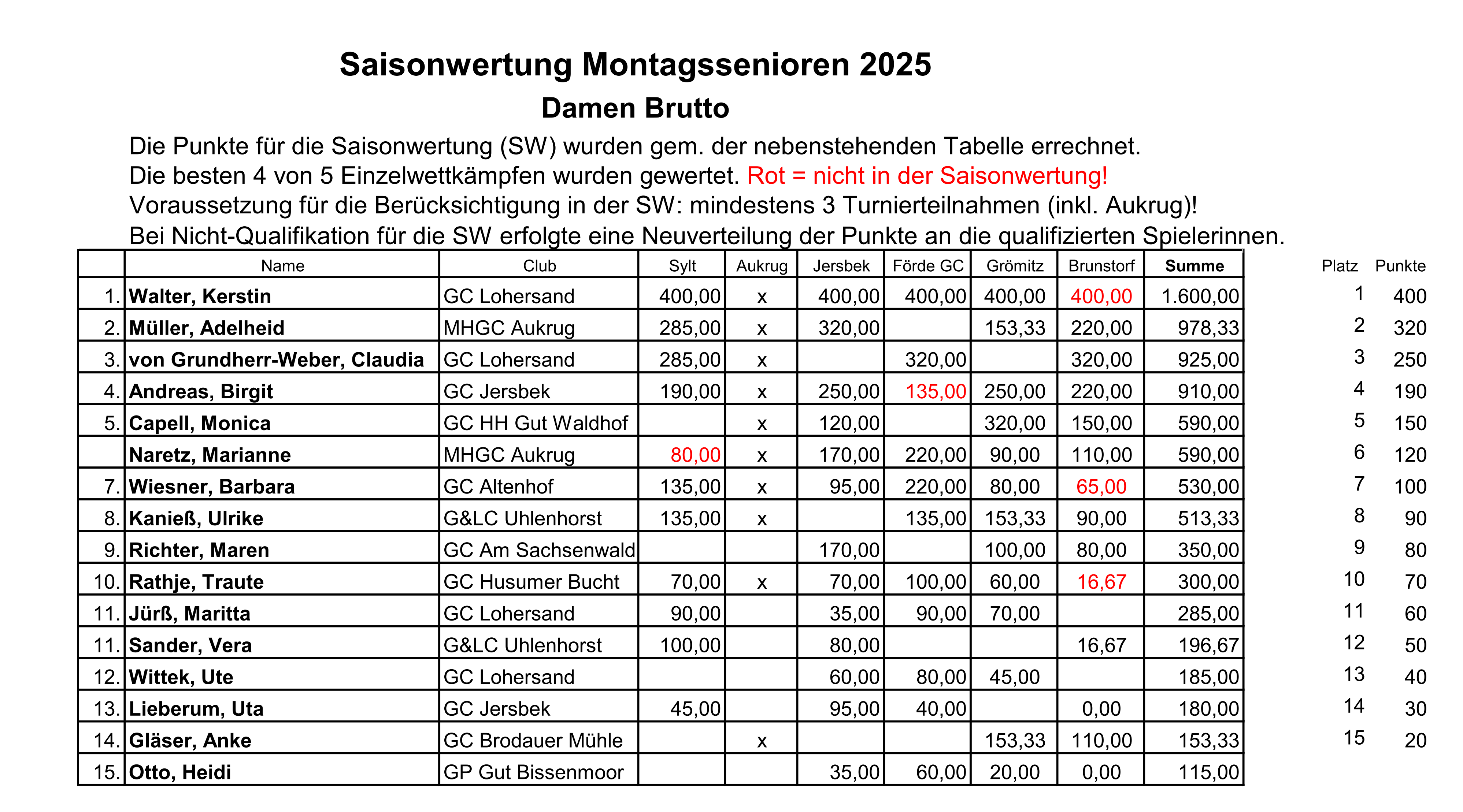 Ergebnisse der Jahreswertung der Montagssenioren 2019