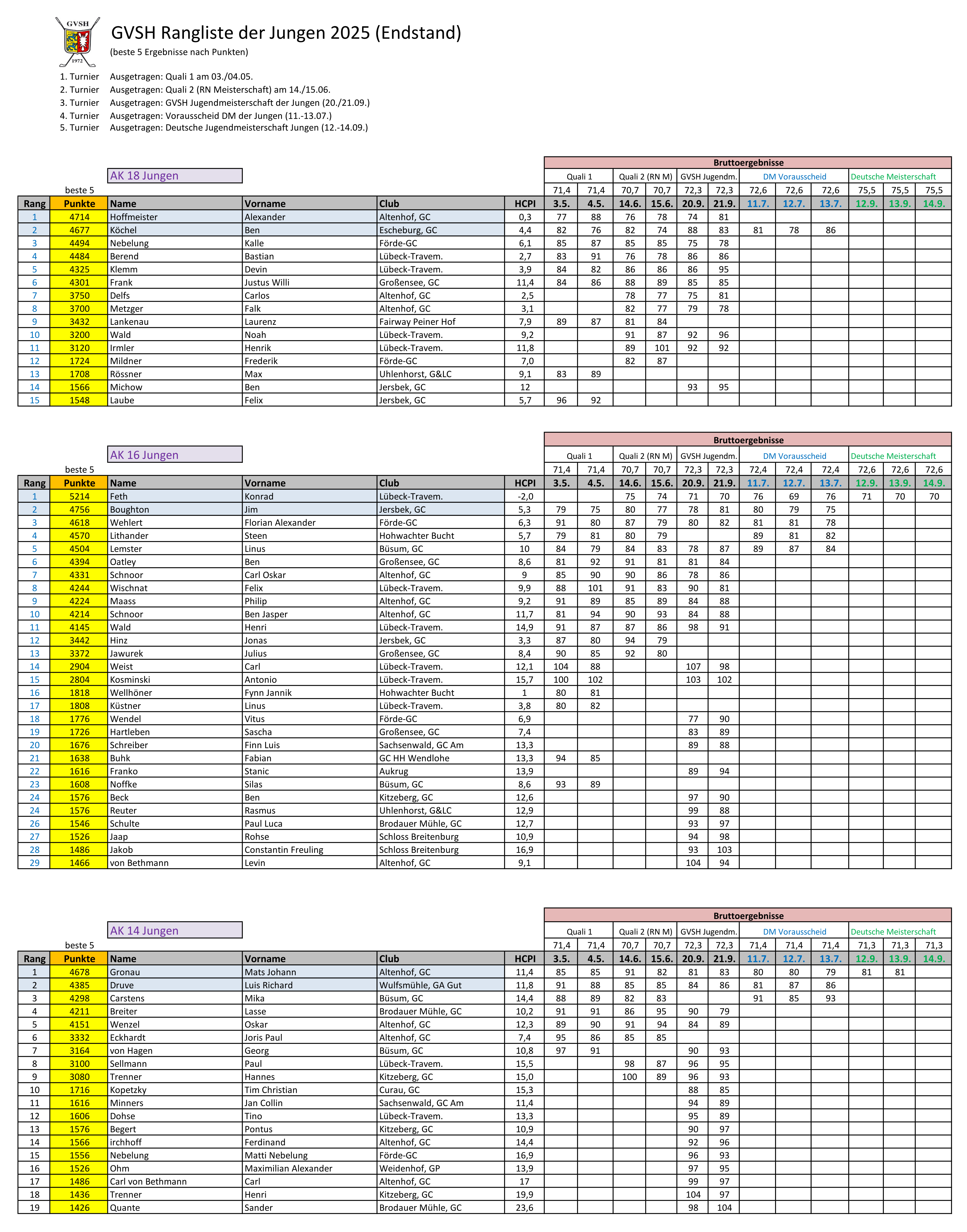 Die GVSH Jugend-Ranglisten der AK 14, AK 16 und AK 18 der Jungen und Mädchen 2024 werden auf dieser Seite im Laufe des Jahres dargestellt.